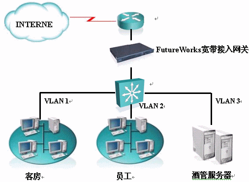 FutureWorks寬帶計費系統(tǒng)針對南京大飯店上網(wǎng)計費的解決方案結(jié)構(gòu)圖