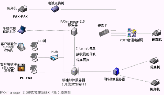 FAXmanager 2.5傳真管理系統(tǒng)安裝在局域網(wǎng)的一臺專用服務器上,運行環(huán)境可以是:Windows98/NT/2000/XP等,此服務器可以同郵件服務器為同一臺機器,構(gòu)成企業(yè)郵件/傳真專用服務器,F(xiàn)AXmanager 2.5可以和企業(yè)郵件系統(tǒng)或群件系統(tǒng)整合使用,可以是Unix/Linux環(huán)境的Qmail和Sendmail等郵件系統(tǒng),也可以是Microsoft Exchange和Lotus Domino/Notes等群件系統(tǒng),當然也可以是IComMail等企業(yè)郵件系統(tǒng),也支持虛擬主機設置企業(yè)郵局開設POP3帳戶和上網(wǎng)代理服務器的使用環(huán)境。