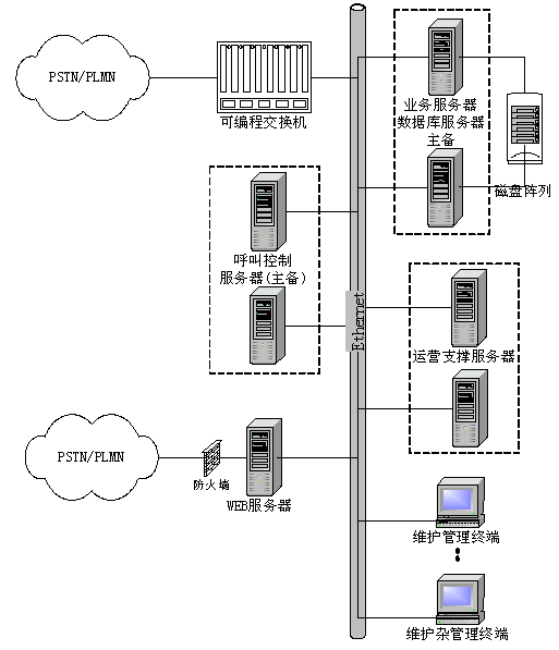 數(shù)據(jù)庫(kù)服務(wù)器是系統(tǒng)的系統(tǒng)數(shù)據(jù)和呼叫記錄(CDR)的數(shù)據(jù)儲(chǔ)存單元,支持SQL Server 2000、Oracle、Sybase等通用關(guān)系數(shù)據(jù)庫(kù)。用戶(hù)數(shù)據(jù)備份可提供數(shù)據(jù)庫(kù)自身備份方式、數(shù)據(jù)庫(kù)熱備份冗余方式。