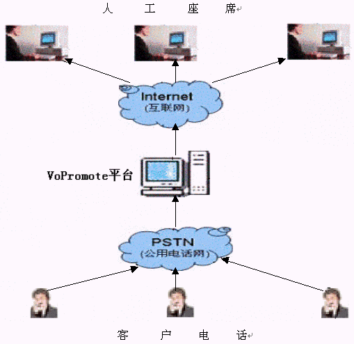 傳統(tǒng)方式為呼叫方撥通電話后直接進(jìn)入電信網(wǎng)絡(luò)以模擬信號(hào)的傳播與被叫方通話。VoPromote語音平臺(tái)的VOIP解決方案為:外呼電話接入VoPromote語音平臺(tái),通過VoPromote語音平臺(tái)的解析后模擬信號(hào)轉(zhuǎn)換為數(shù)字信號(hào)以Internet網(wǎng)為媒介進(jìn)行語音數(shù)據(jù)的傳輸。接收方只需在接入Internet網(wǎng)的計(jì)算機(jī)上安裝聲卡即可通過主機(jī)的聲音輸入/出接口來實(shí)現(xiàn)與對(duì)方的通話。從而利用網(wǎng)互聯(lián)網(wǎng)打一通"免費(fèi)電話"。
