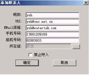 可以在這里進行所給的各項操作,選擇添加聯(lián)系人,輸入某個用戶的各項個人信息,確認后,這個用戶就會被添加到相應(yīng)的組中,并且會顯示出該用戶狀態(tài)。