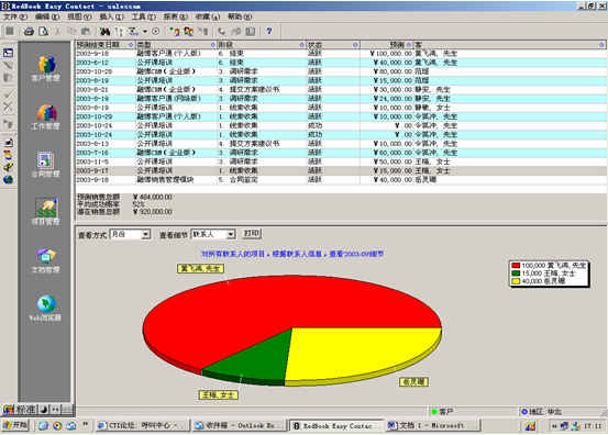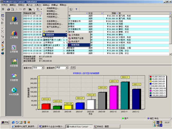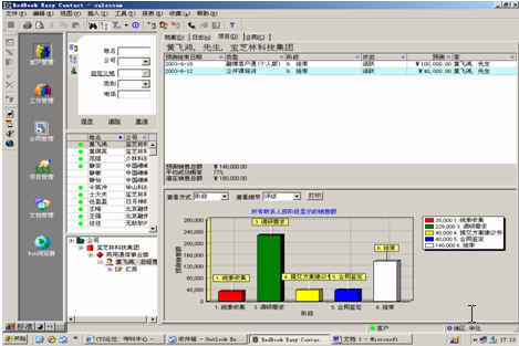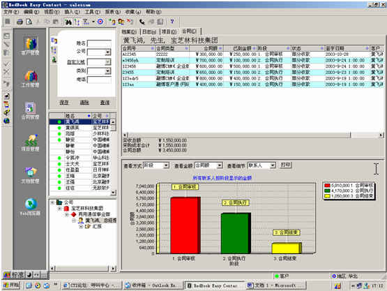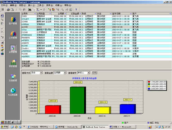 可對(duì)客戶(hù)(雇員)合同,根據(jù)合同階段、月份、合同金額、合同應(yīng)收應(yīng)付款、采購(gòu)成本、客戶(hù)、銷(xiāo)售人員等條件進(jìn)行查詢(xún)和統(tǒng)計(jì), 查詢(xún)統(tǒng)計(jì)結(jié)果以詳細(xì)列表及圖示進(jìn)行顯示。