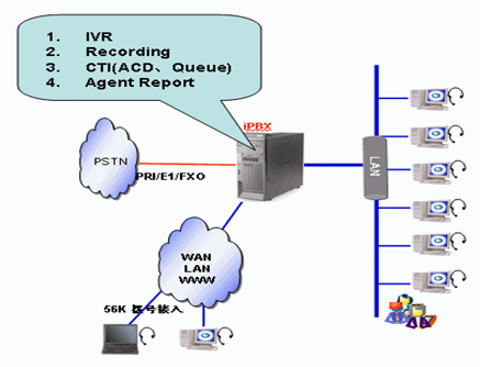 Asterisk IP PBX與相關(guān)板卡結(jié)合就能夠?qū)崿F(xiàn)IP PBX與呼叫中心完美結(jié)合的一體化解決方案。該方案結(jié)合了IP網(wǎng)的靈活性及硬件平臺自身強(qiáng)大的通信能力、板載資源、媒體處理能力和多種接口等而產(chǎn)生的一種高效、便捷、低成本的應(yīng)用方案。與傳統(tǒng)PBX及IP