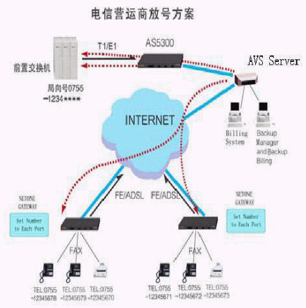 電信運營商放號方案采用寬帶數(shù)據(jù)網(wǎng)絡(luò)接入到運營商,IP電話數(shù)據(jù)流通過寬帶數(shù)據(jù)網(wǎng)絡(luò)接入運營商的局端網(wǎng)關(guān)設(shè)備,或者直接進(jìn)入IP電話網(wǎng)絡(luò)。與傳統(tǒng)的電話相比,電信運營商放號方案不需要太多的額外投資購買硬件設(shè)備;只需在用戶端安裝NETONE語音網(wǎng)關(guān)或IP電話機,話吧、網(wǎng)吧、企業(yè)網(wǎng)用戶、校園網(wǎng)用戶及個人用戶就可以在現(xiàn)有的網(wǎng)絡(luò)基礎(chǔ)上實現(xiàn)IP電話放號服務(wù)。