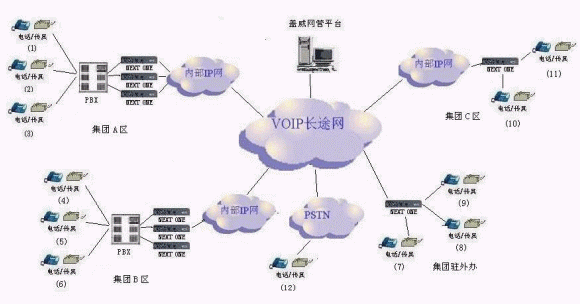 深圳市蓋威科技有限公司完整的語音解決方案如下,用一個網(wǎng)管平臺(AVS SERVER)來管理眾多企業(yè),各企業(yè)分支機構(gòu)間可以實現(xiàn)相互通話免話費,另外將企業(yè)內(nèi)部通話之外的電話通過網(wǎng)管平臺接入到電信營運商的VoIP