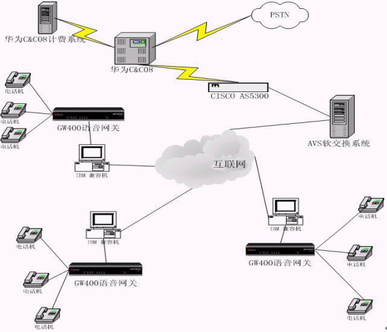 方案中使用到的設備與軟件有:普通電話機,語音網關,電腦,ABS計費軟件,上網設備,AVS軟交換系統,CISCO AS5300,華為C&C08機計費系統