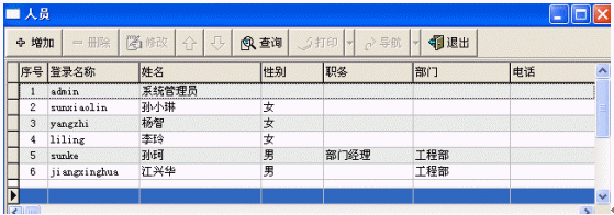 人員管理主要是對本系統(tǒng)的使用者進行管理(增加/修改/刪除/查詢),包括使用者所在的部門、職務等