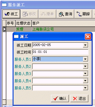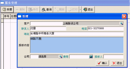 主要登記產(chǎn)品信息、客戶信息、服務合同、售后服務卡,接受客戶的投訴或請求,進行派工和派工的跟蹤。
