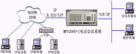 系統(tǒng)提供IP接口與NGN或企業(yè)IP數(shù)據(jù)網(wǎng)相連,用戶可通IP軟件終端、IP電話會議終端、IP電話機(jī)參加會議。