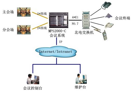 該會(huì)議系統(tǒng)通過(guò)4個(gè)數(shù)字中繼,與北電用戶交換機(jī)互連,采用PRI信令。與視頻會(huì)議系統(tǒng)主會(huì)場(chǎng)采用四線音頻接口接主會(huì)場(chǎng)調(diào)音臺(tái),保證與視頻會(huì)議系統(tǒng)音頻的無(wú)縫對(duì)接。通過(guò)以太網(wǎng)口與局域網(wǎng)連接,實(shí)現(xiàn)維護(hù)管理及會(huì)議控制等功能。