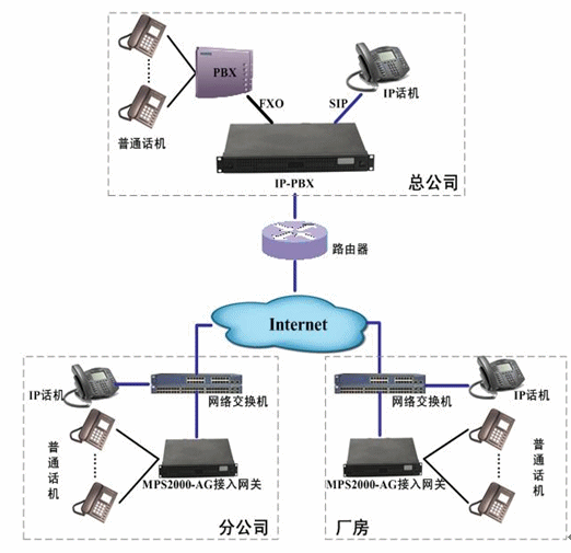各分公司根據(jù)實(shí)際分機(jī)數(shù)配置相應(yīng)的接入網(wǎng)關(guān)或IP話(huà)機(jī)。接入網(wǎng)關(guān)和IP話(huà)機(jī)通過(guò)Internet注冊(cè)到位于總公司的IP-PBX上,實(shí)現(xiàn)了總部電話(huà)和分公司、廠房電話(huà)之間的通信、號(hào)碼直撥、來(lái)電顯示等功能。
