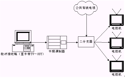 本系統(tǒng)接收端接收實時廣播時,除了用普通PC機收看,或把PC機接收到的信號輸?shù)诫娨暎ù笃粒┥鲜湛,甚至還可以接入有線電視網(wǎng)進行播放。具體方法是通過一個接收端接收股評節(jié)目,通過帶TV-OUT的顯卡把TV信號輸出到中頻調(diào)制設備,中頻調(diào)制設備可以把基帶模擬信號轉(zhuǎn)換成一個有線電視信號,且傳輸距離遠,損失小,再把這個信號與有線電視信號一起接入一個二分支器(2進1出),這就可以和公共有線電視共存,形成自己的頻道,供電視接收。