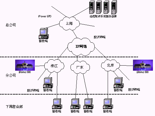 某證券公司有三級網(wǎng)絡,總公司、分公司和下屬營業(yè)部?偣镜椒止編捠2M,在總公司配置一套會議室型電視會議終端POLYCOM 970和一套多點會議服務器Radvision ViaIP400。在分公司配置了38套會議室型電視會議終端POLYCOM 680,用于與總公司進行雙向視頻會議。分公司到營業(yè)部帶寬是512K,各營業(yè)部安裝遠程股評系統(tǒng)接收端程序,遠程股評系統(tǒng)服務器都放置在海通總公司。當在總公司進行股評時,總公司本地攝像頭拍攝教師畫面,MIC采集教師聲音,傳給服務器編碼,再通過網(wǎng)絡供各個接收端接收;當在分公司進行股評時,首先分公司的電視會議設備采集教師畫面及聲音傳回總公司的電視會議設備,再傳給遠程股評系統(tǒng)的服務器進行編碼,然后通過網(wǎng)絡發(fā)布,供接收端接收。(結構如下圖)
