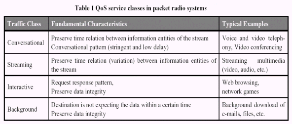 3G無線傳輸堆棧通常由二種不同類型的輸送介質(zhì)組成,專用和共享信道。然而,使用專用信道用戶可以獲得固定帶寬用于傳輸數(shù)據(jù),但使用共享信道用戶只有在動態(tài)的帶寬下傳輸數(shù)據(jù),類似于ATM或GSM GPRS。HSDPA將會成為共享信道在空中的一個擴展。除了MMS,在3G系統(tǒng)的初始階段所有的流媒體和會話應(yīng)用都希望使用專用信道。 在現(xiàn)代的系統(tǒng)設(shè)計中,一個應(yīng)用可以請求許多不同的服務(wù)質(zhì)量(QoS)級別的其中之一。服務(wù)質(zhì)量級別包含最大誤碼率、最大延遲和最大保證的帶寬等參數(shù)。此外,通常根據(jù)不同的應(yīng)用分為不同的服務(wù)級別:會話應(yīng)用、流媒體應(yīng)用、交互應(yīng)用以及后臺通信應(yīng)用。特性和典型的例子見表1。