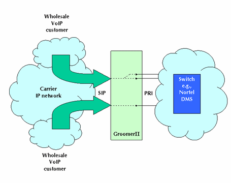 圖1中的GroomerII支持PRI協(xié)議,如:NI-2、ETS300和INS1500等,可以實(shí)現(xiàn)網(wǎng)關(guān)的功能把運(yùn)營(yíng)商自己的電路交換網(wǎng)和IP網(wǎng)絡(luò)相互連接在一起。這種設(shè)置允許網(wǎng)絡(luò)運(yùn)營(yíng)商向其他業(yè)務(wù)供應(yīng)商提供批量VoIP業(yè)務(wù)。這類(lèi)業(yè)務(wù)運(yùn)營(yíng)商據(jù)此可以向他們的客戶(hù)提供具有區(qū)分性的業(yè)務(wù),如:利用SIP電話(huà)呼叫等。