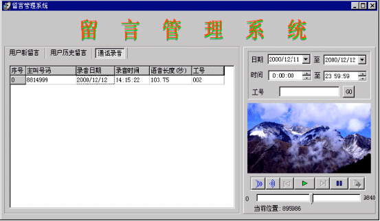 當(dāng)系統(tǒng)中無(wú)話務(wù)員登錄或等待超過(guò)20秒,則進(jìn)入語(yǔ)音信箱服務(wù)。語(yǔ)音信箱在進(jìn)入時(shí)提示用戶:“系統(tǒng)正忙,請(qǐng)留下您的聯(lián)系電話,復(fù)本機(jī)號(hào)請(qǐng)掛機(jī),復(fù)其他號(hào)碼請(qǐng)輸入電話號(hào)碼,按‘#’號(hào)鍵結(jié)束,或者在聽到‘嘟’的一聲之后留下你的留言”,當(dāng)主叫號(hào)碼位數(shù)不夠7位時(shí),提示:“系統(tǒng)正忙,請(qǐng)輸入您的聯(lián)系電話,按‘#’號(hào)鍵結(jié)束,或者在聽到‘嘟’的一聲之后留下你的留言”,系統(tǒng)將客戶留下的電話號(hào)碼記錄到數(shù)據(jù)庫(kù)中。將留言存放到一個(gè)指定目錄中,用話務(wù)號(hào)作為語(yǔ)音文件名。
