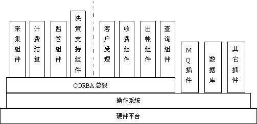 長途電話聯(lián)機(jī)計費(fèi)系統(tǒng) 長話計費(fèi)系統(tǒng)既包括計費(fèi)結(jié)算系統(tǒng),又包括營業(yè)服務(wù)系統(tǒng),功能比較多,數(shù)據(jù)處理流程也相對復(fù)雜。 簡單的傳統(tǒng)數(shù)據(jù)庫的機(jī)械化編程已很難滿足系統(tǒng)對大數(shù)據(jù)量的處理及靈活性等方面的要求,因此在這套系統(tǒng)中,我們采用了一些當(dāng)今業(yè)界的熱門技術(shù)。比如采用了CORBA軟總線思想和MQ Series消息管理隊列,也使之成為聯(lián)機(jī)計費(fèi)系統(tǒng)平臺的一次成功實(shí)施。其系統(tǒng)層次結(jié)構(gòu)圖如下: