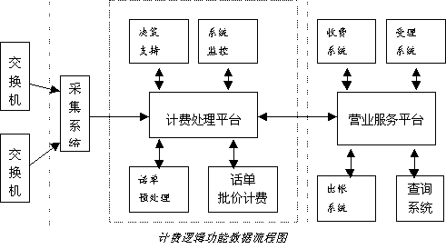 從邏輯功能上分,它經(jīng)常被分為三部分:采集系統(tǒng)、計費(fèi)處理系統(tǒng)、營業(yè)服務(wù)系統(tǒng)。其具體數(shù)據(jù)流程如下圖所示:
