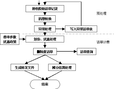 區(qū)域計費(fèi)中心從交換機(jī)實(shí)時/定時采集原始話單數(shù)據(jù),它是整個系統(tǒng)的起始點(diǎn),也是系統(tǒng)其它部分的基礎(chǔ)。其性能直接影響整個系統(tǒng)的運(yùn)行效果。對該模塊要求穩(wěn)定可靠、處理靈活。 “八國九制”意味著,一個好的計費(fèi)采集系統(tǒng),必然要求它能夠處理多種交換機(jī)格式。比如EWSD、S1240、5ESS等等。 在采集所用網(wǎng)絡(luò)傳輸協(xié)議上,一般要求系統(tǒng)支持X.25/FTAM、X.25/CMIP等協(xié)議。 2.計費(fèi)結(jié)算 采集機(jī)從交換機(jī)上采集下來原始話單文件,該類文件是BCD碼文件,需要進(jìn)行碼型轉(zhuǎn)換,變成ASCII碼文件,為后續(xù)的計費(fèi)處理創(chuàng)造條件。 話單格式轉(zhuǎn)換:話單格式轉(zhuǎn)換從交換機(jī)下載的二進(jìn)制信息中提取用于計費(fèi)和統(tǒng)計的信息,并從二進(jìn)制格式轉(zhuǎn)換為文本格式。但是由于上面提到的原因,國內(nèi)交換機(jī)種類比較多,各種交換機(jī)的數(shù)據(jù)格式都不相同,即使是相同的交換機(jī),由于需要版本升級,也會對數(shù)據(jù)格式產(chǎn)生影響。假如預(yù)處理模塊不能靈活地處理各種格式的文件,則勢必會對電信服務(wù)商的投資造成浪費(fèi)。國創(chuàng)公司在話單預(yù)處理中,提供了一種“自定義話單格式”方式,用戶可以根據(jù)自己交換機(jī)的數(shù)據(jù)格式進(jìn)行配置,而預(yù)處理模塊不需進(jìn)行修改。即可以適應(yīng)當(dāng)前多種交換機(jī)并存的局面,又可以適應(yīng)未來交換機(jī)版本升級的需求,極大地保護(hù)了用戶的投資。 計費(fèi)劃價處理: 計費(fèi)計算模塊根據(jù)話單中記錄的起始時間、通話時長、對端號碼等信息在資費(fèi)策略庫中查找滿足條件的費(fèi)率極其優(yōu)惠策略。從而計算出此次通話應(yīng)向用戶收取的基本費(fèi)用。特別地,考慮到業(yè)務(wù)的發(fā)展與變化,系統(tǒng)可對費(fèi)用中的各項子費(fèi)用單獨(dú)計算,并能夠適應(yīng)新的優(yōu)惠策略的增加。整個計費(fèi)流程如下: