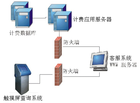 。。觸摸屏查詢系統(tǒng)通過WWW方式訪問鐵通客服系統(tǒng)的WEB服務(wù)器,再由WEB服務(wù)器訪問計(jì)費(fèi)系統(tǒng)的應(yīng)用服務(wù)器,由應(yīng)用服務(wù)器上的代理訪問計(jì)費(fèi)系統(tǒng)的數(shù)據(jù)庫。由于觸摸屏查詢系統(tǒng)與客服系統(tǒng)WEB服務(wù)器之間、客服系統(tǒng)WEB服務(wù)器與計(jì)費(fèi)應(yīng)用服務(wù)器每層都有網(wǎng)絡(luò)防火墻進(jìn)行隔離,同時客服系統(tǒng)的WEB服務(wù)器并不直接訪問計(jì)費(fèi)數(shù)據(jù)庫,因此可以保證計(jì)費(fèi)系統(tǒng)的數(shù)據(jù)安全。在觸摸屏上用戶除了訪問系統(tǒng)提供的功能以外,不能做任何操作,再次保證了系統(tǒng)的安全可靠。