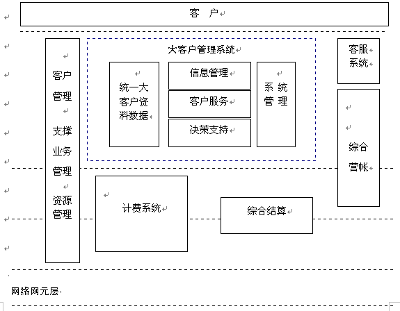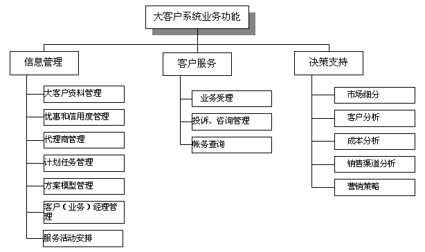 電信大客戶管理系統(tǒng)是在收集大客戶市場(chǎng)調(diào)查信息、大客戶資料信息、大客戶經(jīng)營戰(zhàn)略資源的基礎(chǔ)上,自動(dòng)采集專業(yè)計(jì)費(fèi)、綜合營帳、客服、網(wǎng)管、財(cái)務(wù)等系統(tǒng)的相關(guān)數(shù)據(jù),實(shí)現(xiàn)快速、全面、準(zhǔn)確的新客戶業(yè)務(wù)受理、新增需求受理及故障處理過程通道,實(shí)現(xiàn)完善的客戶經(jīng)理管理、代理商管理系統(tǒng),最終實(shí)現(xiàn)完整的大客戶滿意度評(píng)估體系和針對(duì)大客戶的個(gè)性化服務(wù)。建成后的系統(tǒng)從管理、服務(wù)、分析三方面出發(fā)主要應(yīng)具備信息管理、客戶服務(wù)、決策支持功能。