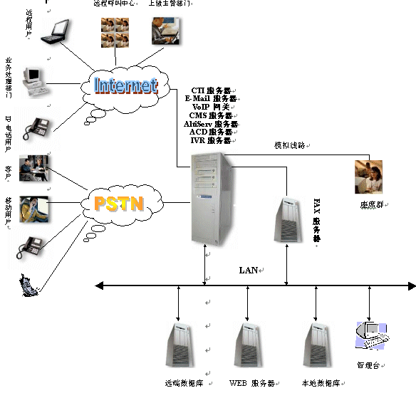 另一方面,CTI(計(jì)算機(jī)語音集成)技術(shù)的出現(xiàn),實(shí)現(xiàn)了通信技術(shù)與計(jì)算機(jī)技術(shù)的結(jié)合,利用計(jì)算機(jī)技術(shù)可以大大增加服務(wù)的信息量、提高速度、拓展新型客戶服務(wù)業(yè)務(wù)。因此為了滿足計(jì)算機(jī)、信息技術(shù)的演進(jìn)和客戶服務(wù)的需求,利用CTI技術(shù),面向用戶,提供綜合服務(wù)的客戶服務(wù)中心系統(tǒng)應(yīng)運(yùn)而生。對于用戶,客戶服務(wù)中心系統(tǒng)能夠提供更優(yōu)質(zhì)的用戶服務(wù),用戶能從服務(wù)方得到最快的響應(yīng),能夠得到24小時的持續(xù)服務(wù),能夠同時得到語音、圖象、數(shù)據(jù)多方面的信息支持。對于企業(yè),客戶服務(wù)中心在提高客戶服務(wù)質(zhì)量的同時,還能有效的控制成本、增加收入,樹立專業(yè)化的企業(yè)形象,建立完善的客戶服務(wù)資料庫。