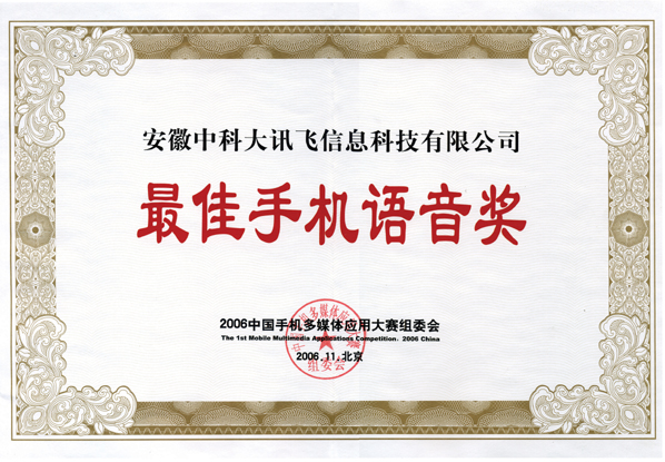 近日,首屆中國手機(jī)多媒體應(yīng)用大賽組委會將“2006最佳手機(jī)語音獎(jiǎng)”這份沉甸甸的獎(jiǎng)牌和證書授予了科大訊飛。這一由數(shù)十位業(yè)界專家和百萬手機(jī)用戶慎重評選出的獎(jiǎng)項(xiàng),充分說明了科大訊飛在手機(jī)語音應(yīng)用領(lǐng)域的領(lǐng)先地位,其分量不言而喻。