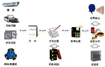 -----按照人類言語功能的不同層次,語言合成也可分成三個層次,它們是:(1)從文字到語音的合成(Text-To-Speech);(2)從概念到語音的合成(Concept-To-Speech);(3)從意向到語音的合成(Intention-To-Speech)。這三個層次反映了人類大腦中形成說話內容的不同過程,涉及人類大腦的高級神經活動。不難想象,即使是按規(guī)則的文字到語音合成(文語合成)也已經是相當困難的任務。為了合成出高質量的語言,除了依賴于各種規(guī)則,包括語義學規(guī)則、詞匯規(guī)則、語音學規(guī)則外,還必須對文字的內容有很好的理解,這將涉及自然語言理解的問題。從這一點講,文語轉換系統(tǒng)實際上也可看作一個人工智能系統(tǒng)。圖1顯示了一個完整的文語轉換系統(tǒng)示意圖。文語轉換過程是先將文字序列轉換成音韻序列,再由語音合成器生成語音波形。其中第一步涉及語言學處理,例如分詞、字音轉換等,以及一整套有效的韻律控制規(guī)則;第二步需要先進的語音合成技術,能按要求實時合成出高質量的語音流。因此一般說來,文語合成系統(tǒng)都需要一套復雜的文字序列到音素序列的轉換程序,也就是說,文語轉換系統(tǒng)不僅要應用數(shù)字信號處理技術,而且必須有大量的語言學知識的支持。當然其中語音合成終究還是最基本的部分,它相當于“人工嘴巴”,任何語言合成系統(tǒng)包括文語轉換系統(tǒng),都離不開語音合成器。