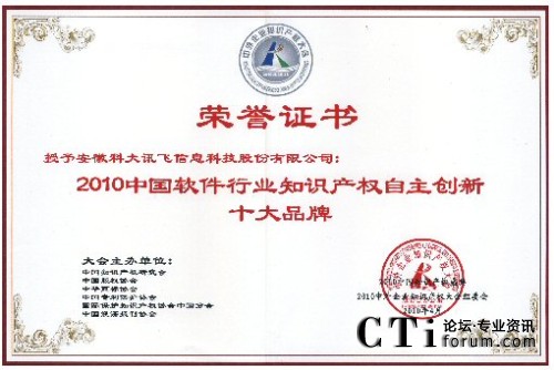 CTI論壇(ctiforum)4月29日消息(記者 潘婷婷):2010年4月25日,由中國(guó)知識(shí)產(chǎn)權(quán)研究會(huì)、中國(guó)專利保護(hù)協(xié)會(huì)、中國(guó)版權(quán)協(xié)會(huì)等單位聯(lián)合舉辦的“2010中外企業(yè)知識(shí)產(chǎn)權(quán)大會(huì)”在人民大會(huì)堂隆重舉行。在當(dāng)日的“2010中國(guó)知識(shí)產(chǎn)權(quán)盛典頒獎(jiǎng)典禮”中,科大訊飛憑借強(qiáng)大的自主創(chuàng)新能力以及在知識(shí)產(chǎn)權(quán)創(chuàng)造、保護(hù)與應(yīng)用方面的突出表現(xiàn)獲評(píng)“2010年中國(guó)軟件行業(yè)知識(shí)產(chǎn)權(quán)自主創(chuàng)新十大品牌”。