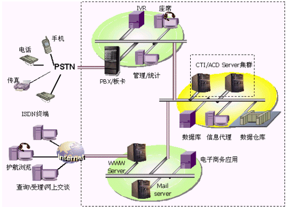 將PSTN訪問、Internet訪問有機(jī)結(jié)合,對傳統(tǒng)呼叫中心進(jìn)行擴(kuò)充,支持多種接入方式,多種交流渠道,具有傳統(tǒng)呼叫中心無法比擬的優(yōu)越性。