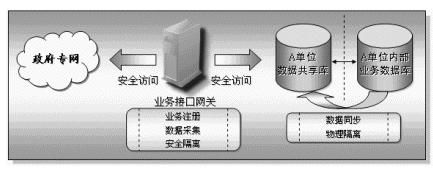 業(yè)務(wù)接入網(wǎng)關(guān)放置在每一個(gè)接入到本系統(tǒng)的部門(mén)或單位內(nèi),具有快速方便的異構(gòu)數(shù)據(jù)庫(kù)的連接能力,它主要完成兩個(gè)方面的功能,一方面實(shí)現(xiàn)本部門(mén)共享信息的對(duì)外發(fā)布,另一方面也通過(guò)核心的信息交換機(jī)實(shí)現(xiàn)其它相關(guān)部門(mén)的共享信息的采集工作。業(yè)務(wù)接口網(wǎng)關(guān)具有兩個(gè)網(wǎng)絡(luò)接口,一端連接本單位的內(nèi)部網(wǎng)絡(luò),另一端接入政府專網(wǎng)中。