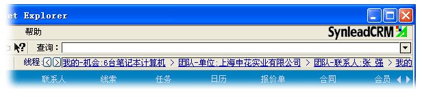 值得欣喜的是,部分CRM廠商意識到用戶迷路問題的嚴重性,并清楚IE瀏覽器具備的頁面歷史尋址(History Location)功能滿足不了頁面內(nèi)數(shù)據(jù)庫復(fù)雜、動態(tài)歷史條件的記憶,必須另外打造屬于CRM應(yīng)用程序自身的歷史堆棧。少許CRM軟件開始提供歷史“后退”、“前進”按鈕,SynleadCRM歷史精確度保持領(lǐng)先地位。