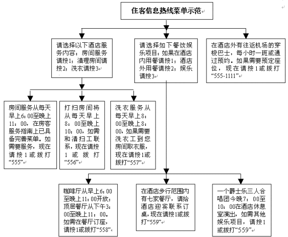 由于可在任一時間通過任一部電話進入熱線,就使得此項語音服務更加方便靈活有價值,如使用酒店分機電話,則住客可隨意撥打,毋須支付電話費用。使用者僅通過按鍵選擇,即可收聽到所需信息。例如,他們可以按"1"來了解酒店服務,按"2"聽取餐飲娛樂信息。這是一個提供最新信息的良好途徑,并可從當地商業(yè)贊助商中獲得一些收益。