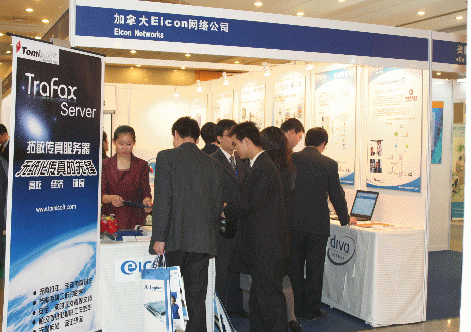 拓敏軟件Tomisoft與加拿大Eicon Networks共同展示了拓敏傳真服務(wù)器TraFax Server----企業(yè)級(jí)無紙化傳真解決方案。在精美的展板與宣傳冊的配合下,通過講解員的專業(yè)介紹,盡情地展示了目前國內(nèi)最優(yōu)秀的無紙化傳真解決方案的非凡風(fēng)采。TraFax Server與CallCenter、 CRM、ERP的完美結(jié)合引起了與會(huì)代表們的關(guān)注。