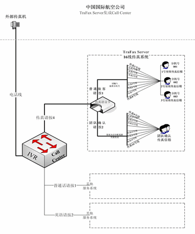 與國(guó)航Call Center集成后的TraFax Server系統(tǒng)共有16條傳真線路,其中一半專門用作接收普通旅客發(fā)來(lái)的傳真,另外8條線路則是為受理團(tuán)體客戶的傳真確認(rèn)而設(shè)。二者不同是,普通客戶在向國(guó)航發(fā)送傳真的過(guò)程中需要根據(jù)系統(tǒng)提示音在發(fā)送前的最后環(huán)節(jié)中輸入明確的坐席分機(jī)號(hào)碼,以使傳真文件發(fā)向分機(jī)號(hào)對(duì)用的坐席傳真信箱中,以此實(shí)現(xiàn)坐席人員對(duì)旅客的一對(duì)一式服務(wù),從而提高服務(wù)水平。而團(tuán)隊(duì)確認(rèn)的傳真無(wú)需輸入坐席分機(jī)號(hào),傳真將被空閑的線路直接發(fā)送到一個(gè)專門的團(tuán)隊(duì)確認(rèn)傳真信箱中,從而確保國(guó)航對(duì)該類傳真的快速處理能力。目前,16線的TraFax