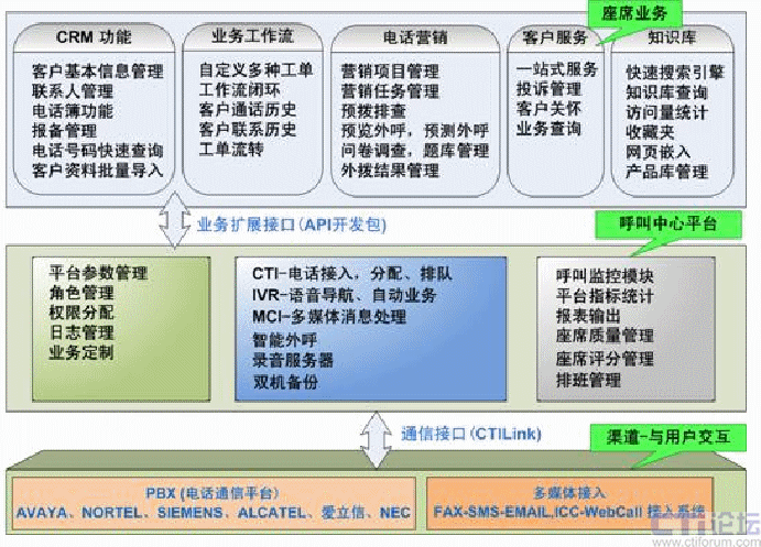 在后端主要由質(zhì)量檢驗和業(yè)務統(tǒng)計、客戶關系管理(UltraCRM)、呼叫管理、監(jiān)控管理系統(tǒng)(CallMonitor)、數(shù)據(jù)庫系統(tǒng)、業(yè)務處理系統(tǒng)以及座席(業(yè)務代表)、以及Internet服務子系統(tǒng)(ICC)等業(yè)務組成。