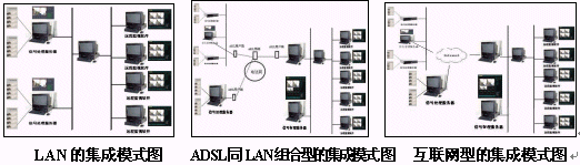 本公司的數(shù)字式視頻監(jiān)控系統(tǒng)各個組成要素之間的物理連接沒有做任何限制及規(guī)定,只要支持國際性的通信標(biāo)準(zhǔn)協(xié)議HTTP,就可以集成出一個面向于某種具體需求的系統(tǒng)。下面列舉了本系統(tǒng)3種典型應(yīng)用的拓?fù)淠J綀D。