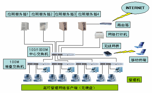 為保證能夠提供更多的應(yīng)用服務(wù),E&E管理機(jī)需配備較大容量的硬盤(pán)(60G以上),如果在管理機(jī)上安裝有比較重要的系統(tǒng)或軟件,更可以在E&E管理機(jī)上增加硬盤(pán)實(shí)現(xiàn)RAD1或RAID5,最大的保護(hù)系統(tǒng)運(yùn)行。E&E管理機(jī)運(yùn)行在100M交換網(wǎng)絡(luò)環(huán)境中。
