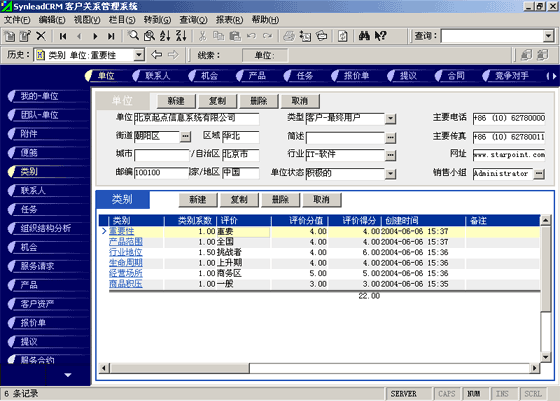 客戶單位的分類較聯(lián)系人的分類更復(fù)雜。常用的分類有:按照企業(yè)規(guī)模來分類(大、中、小,層次自定義,下同)、按照該客戶與本單位的緊密程度分類(緊密、普通、疏遠(yuǎn))、按照該客戶的重要性分類(重要、普通、次要)、按照該客戶的忠誠(chéng)度分類(忠誠(chéng)、普通、游移)。有一些用戶企業(yè),希望對(duì)客戶單位特征進(jìn)行采集,進(jìn)而進(jìn)行客戶信用評(píng)價(jià)。信用特征的類別可以多達(dá)數(shù)十種類(詳細(xì)情況可參考有關(guān)書籍)。利用SynleadCRM,您可以為每個(gè)類指定系數(shù),為類下屬的每個(gè)評(píng)價(jià)指定評(píng)分分值。例如,您可以建立一個(gè)類別為"客戶倉庫積壓商品的情況",系數(shù)為1,該類別下屬的評(píng)價(jià)有"很多1分"、"一般3分"、"少1分"、"未知0分",如果指定某客戶該類別的評(píng)價(jià)為一般,則該項(xiàng)目得分為3分*1(系數(shù))=3分。依此類推,您還可以指定更多的分類與評(píng)價(jià),例如:客戶經(jīng)營(yíng)場(chǎng)所所處的位置、客戶在企業(yè)生命周期中所處的位置、客戶在行業(yè)中的地位、客戶產(chǎn)品的組合情況、客戶產(chǎn)品覆蓋的市場(chǎng)范圍、客戶產(chǎn)品的淡旺季規(guī)律、客戶近年?duì)I業(yè)額的增減趨勢(shì)、客戶的年度營(yíng)業(yè)額、客戶的現(xiàn)金周轉(zhuǎn)能力、客戶的負(fù)債情況、客戶是否涉及中大訴訟等。每一個(gè)類別項(xiàng)目的評(píng)分經(jīng)過系數(shù)的加權(quán)運(yùn)算后,可以求和,得到這個(gè)客戶的總評(píng)分。未來也可以利用分析模型對(duì)此類數(shù)據(jù)進(jìn)行進(jìn)一步的分析,提供輔助決策所需要的圖表和報(bào)表。