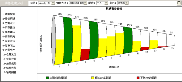 如果缺乏可預(yù)見的銷售進(jìn)程管理,企業(yè)的銷售目標(biāo)將難以順利實(shí)現(xiàn);手工的、基于結(jié)案的銷售收入統(tǒng)計(jì)造成的滯后性,降低了企業(yè)靈活應(yīng)對(duì)復(fù)雜多變市場(chǎng)的能力。幸好,CRM軟件提供了一套經(jīng)典的銷售進(jìn)程可視化管理工具,它包括銷售管道圖和銷售預(yù)測(cè)圖等。