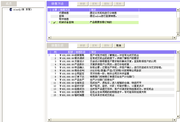 一套好的CRM軟件,應(yīng)當(dāng)同時(shí)支持多種銷售方法。例如,精密機(jī)械制造行業(yè),有可能同時(shí)需要支持四種銷售方法:標(biāo)準(zhǔn)整機(jī)銷售方法、項(xiàng)目型整機(jī)銷售方法、零件及有償服務(wù)銷售方法、三包件等。每個(gè)銷售方法都有對(duì)應(yīng)的銷售流程。以圖2為例,我們看到"機(jī)械設(shè)備直銷"的銷售方法,對(duì)應(yīng)著15個(gè)銷售階段,每個(gè)階段都可通過簡(jiǎn)述來(lái)明確該階段典型的業(yè)務(wù)特征、成交可能性的區(qū)間,以便銷售代表在操作記錄的時(shí)候擁有共識(shí)。