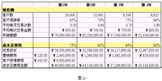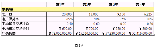 第1年,平均每個(gè)客戶每個(gè)月交易的次數(shù)是0.50次,平均每次的交易金額是¥650.00,因此第1年的銷(xiāo)售額是¥650.00*(0.5次/月*12個(gè)月)*20,000