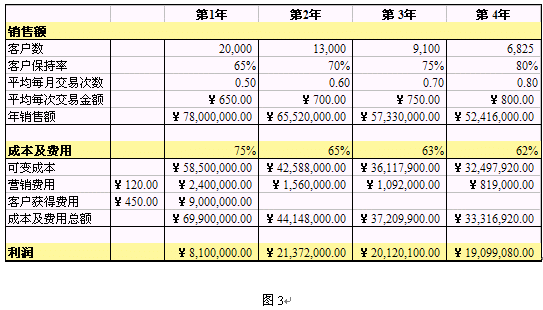 如圖3所示,將各年的銷(xiāo)售額分別減去成本及費(fèi)用,就得到各年度的利潤(rùn)額。我們發(fā)現(xiàn)這一組客戶貢獻(xiàn)的利潤(rùn),從第1年的¥8,100,000.00到第2年的¥21,372,000.00,有顯著上升;利潤(rùn)在第2年達(dá)到頂點(diǎn)后,逐年緩慢下降,下降的幅度比較小。