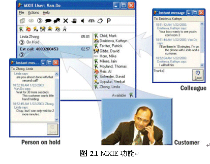 使用MXIE還提供了文本交流、收發(fā)語(yǔ)音郵件、收發(fā)傳真、發(fā)起電話會(huì)議或視頻會(huì)議、綁定話機(jī)等多種實(shí)用的溝通功能。除此以外,MXIE還集成了軟件電話功能,用戶外出時(shí)可以使用它來(lái)接聽或撥打電話。