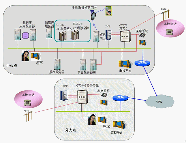 整個網路可以劃分為Internet接入部分、電話接入部分、CTI系統(tǒng)內網、辦公網絡和座席系統(tǒng)5個部分。Internet接入部分實現(xiàn)網絡訪問的受理和轉發(fā);電話接入部分完成電話語音和傳真的接續(xù)和處理;CTI系統(tǒng)內網完成電話呼叫的控制和應用的集成;座席系統(tǒng)部分完成語音和控制信息的接收和處理,為座席提供通話能力和業(yè)務處理能力。