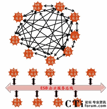 簡單一點,下面兩種構(gòu)架的方式,第一種,雜亂無章,第二種,非常清晰,第二種用的就是ESB的方式。