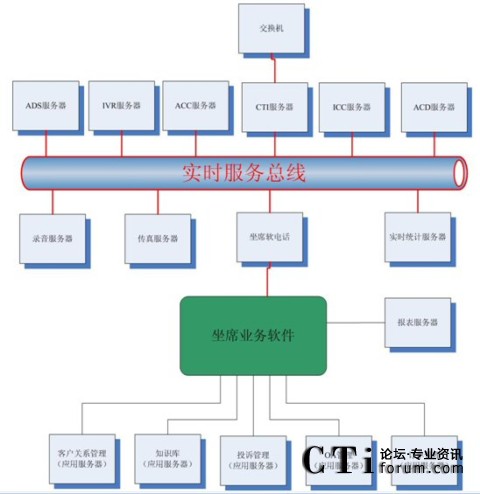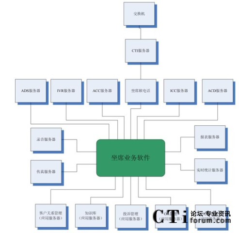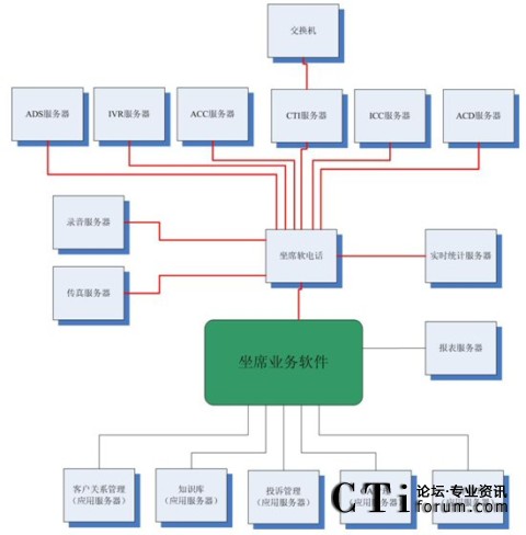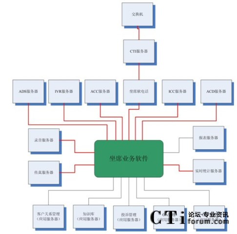 很多集成商或業(yè)務軟件開發(fā)商認為這種結構過于復雜,而他們自身往往提供“整體解決方案”,即所有的服務器軟件基本上都是自己的,根據(jù)客戶的要求修改即可。例如,客戶關系管理、知識庫、投訴管理、OA、訂單管理以及坐席軟電話、ADS服務器、IVR服務器、ACC服務器、ICC服務器、ACD服務器、錄音服務器、傳真服務器、報表服務器、實時統(tǒng)計服務器都是自己來做,那么對于很多接口環(huán)節(jié)都可以節(jié)省了。