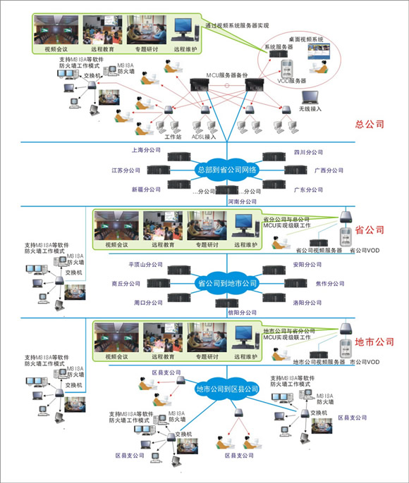 整個網(wǎng)絡(luò)覆蓋到遍布全國各地的省級分公司35家,二級分公司348家,縣級分公司2667家,營業(yè)網(wǎng)點幾千個,整個網(wǎng)絡(luò)共400多臺MCU,5000多個終端。整個系統(tǒng)采用三級級聯(lián)樹狀組網(wǎng),各級分級分權(quán)管理,全網(wǎng)統(tǒng)一調(diào)度,全網(wǎng)終端統(tǒng)一開會。