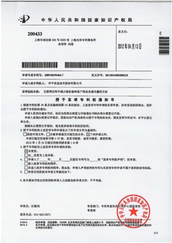 圖為: 互聯(lián)網(wǎng)應(yīng)用中減少服務(wù)器和客戶端業(yè)務(wù)通訊量的方法專利授權(quán)書