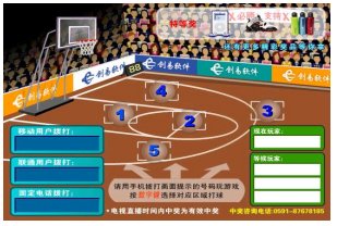 挑戰(zhàn)籃球游戲是一款全新的基于電視/網(wǎng)絡(luò)平臺的體育休閑娛樂游戲,用戶可以借助短信等手段參與游戲,在游戲中不但可以贏取游戲積分,通過積分兌換獎(jiǎng)品,還可以身臨其境地感受賽場上投籃的快感,F(xiàn)在拿起你的手機(jī)或電話,選擇一下角度吧!